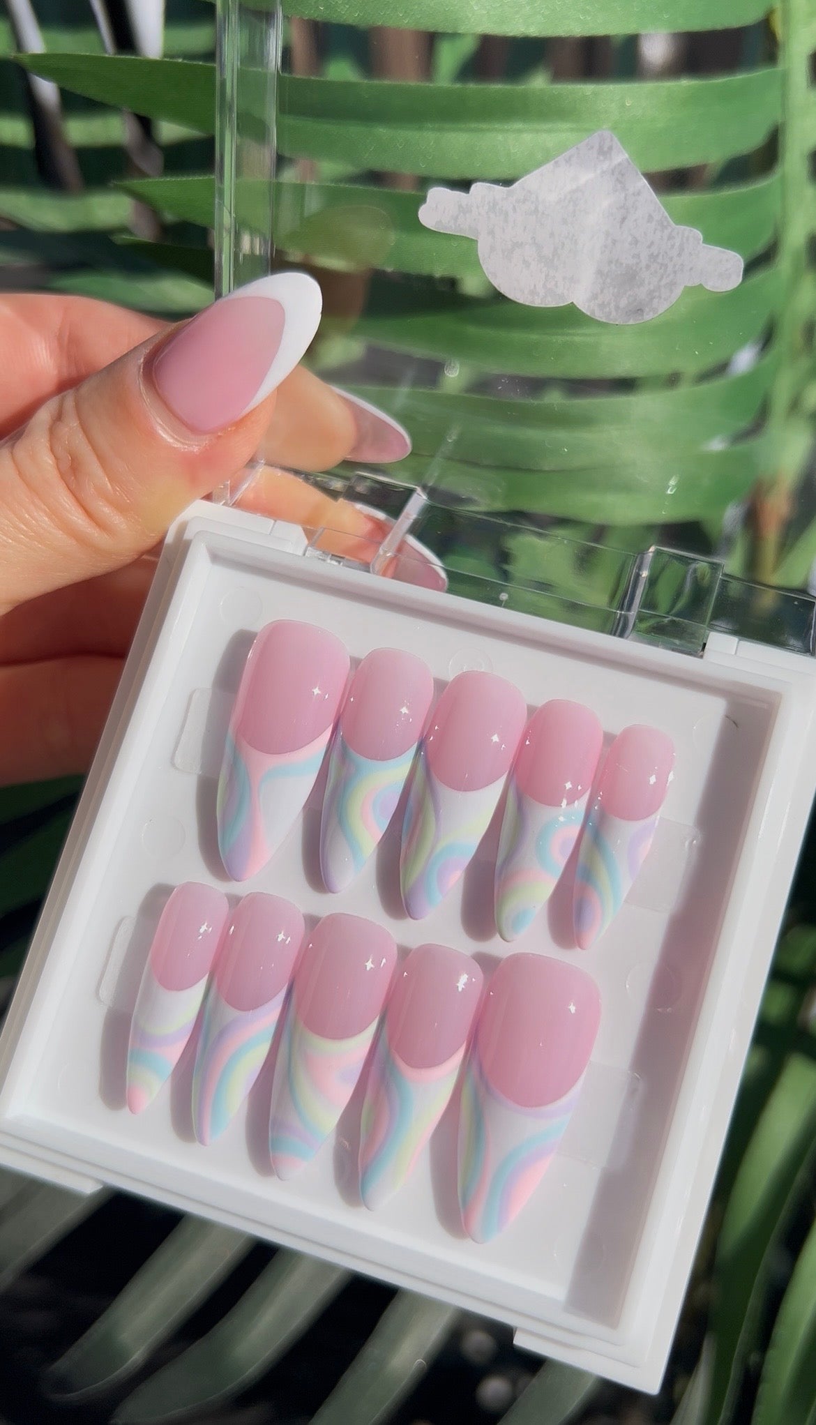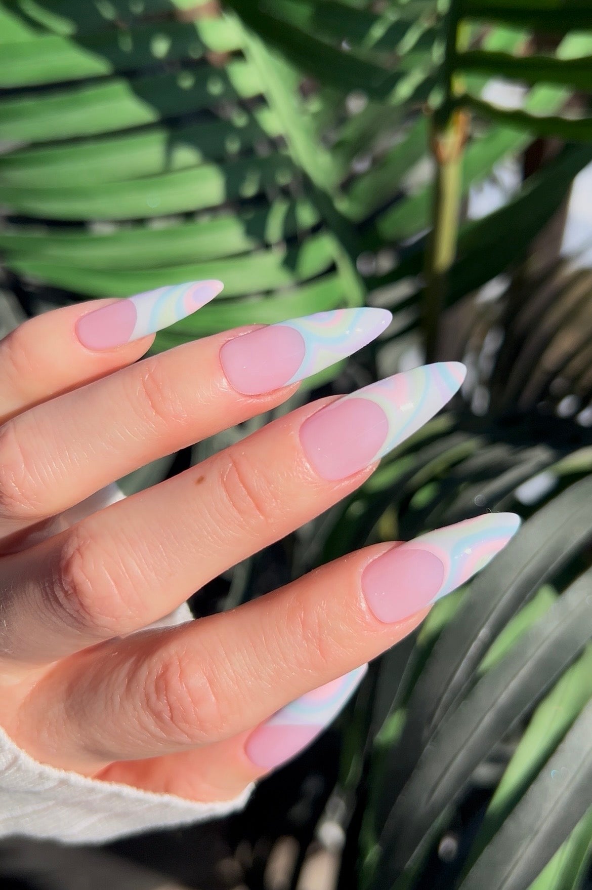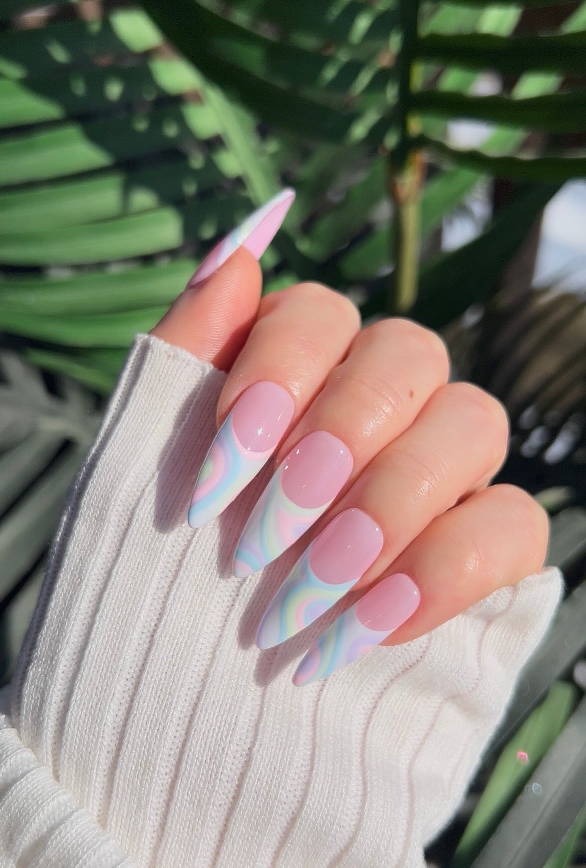 The featured set of nails pictured is in the length and shape long almond